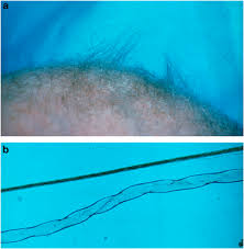 Light microscopy of hair shows individual hairs that are twisted about their own axes (pili torti), with varying shaft diameters (monilethrix), and fragmentation at regular intervals (trichorrhexis nodosa).