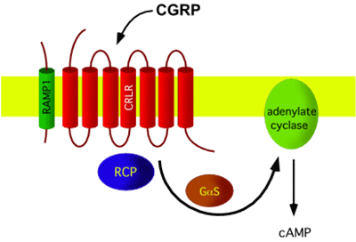 The CGRP receptor is a heterotrimer: a large peptide with 7 transmembrane domains, named calcitonin receptor-like receptor (CLR or CRLR), is supplemented by a small single transmembrane peptide, named receptor activity-modifying protein (RAMP1) that forms the CGRP-specific ligand binding site. In addition, a small intracellular protein component, called receptor component protein (RCP), is necessary for linking the receptor to the intracellular signal-transduction machinery, which operates mainly through G protein Gs and adenylate cyclase, resulting in elevated cAMP levels. CLR shares 55% sequence identity with the calcitonin receptor. RAMPs are relatively small (148-175 aminoacids) proteins which enable expression of CLR on the cell surface, determine the glycosylation state of the receptor, and determine the relative affinity of this receptor for CGRP.