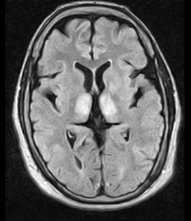 Fig.3: Axial MRI FLAIR image showing hyperintense signal in the mesial dorsal thalami, a common finding in Wernicke encephalopathy. This patient was nearly in coma when IV thiamine was started, he responded moderately well but was left with some Korsakoff type deficits.