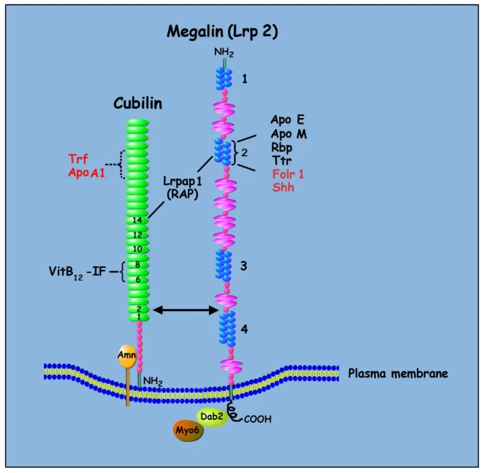 A cartoon diagram of the structure of the cubilin-amnionless-megalin multiligand receptor endocytic complex is shown. Megalin is a cell-surface receptor/transporter consisting of a large extracellular region, a single transmembrane domain, and a C-terminal cytoplasmic tail. The extracellular domain of megalin contains four clusters of lipoprotein receptor ligand-binding repeats (blue), growth factor repeats, an EGF repeat, and YWTD spacer regions. The second cluster of ligand-binding repeats has been identified as a common binding site for several ligands including apolipoprotein E (Apo E), apolipoprotein M (Apo M), retinol binding protein (Rbp), and transthyretin (Ttr). Megalin also binds the soluble form of the folate receptor (Folr1), and the morphogen sonic hedgehog (Shh). The cytoplasmic tail of megalin binds Dab2, a cytosolic adapter protein important for megalin-mediated endocytosis, and Dab2 binds and recruits Myo6 to clathrin-coated vesicles. The receptor-associated protein (Lrpap1; RAP) binds both megalin and cubilin. Cubilin is a peripheral membrane receptor comprised of a short amino terminal, eight EGF type domains, and 27 CUB domains (green). The amino-terminal end of cubilin is attached to the extracellular part of amnionless (Amn), and amnionless provides the transmembrane domain necessary for the anchoring and endocytic trafficking of cubilin. Cubilin ligands include transferring (Trf), albumin, hemoglobin, apolipoprotein A1 (ApoA1), and intrinsic factor (IF)-vitamin B12.
